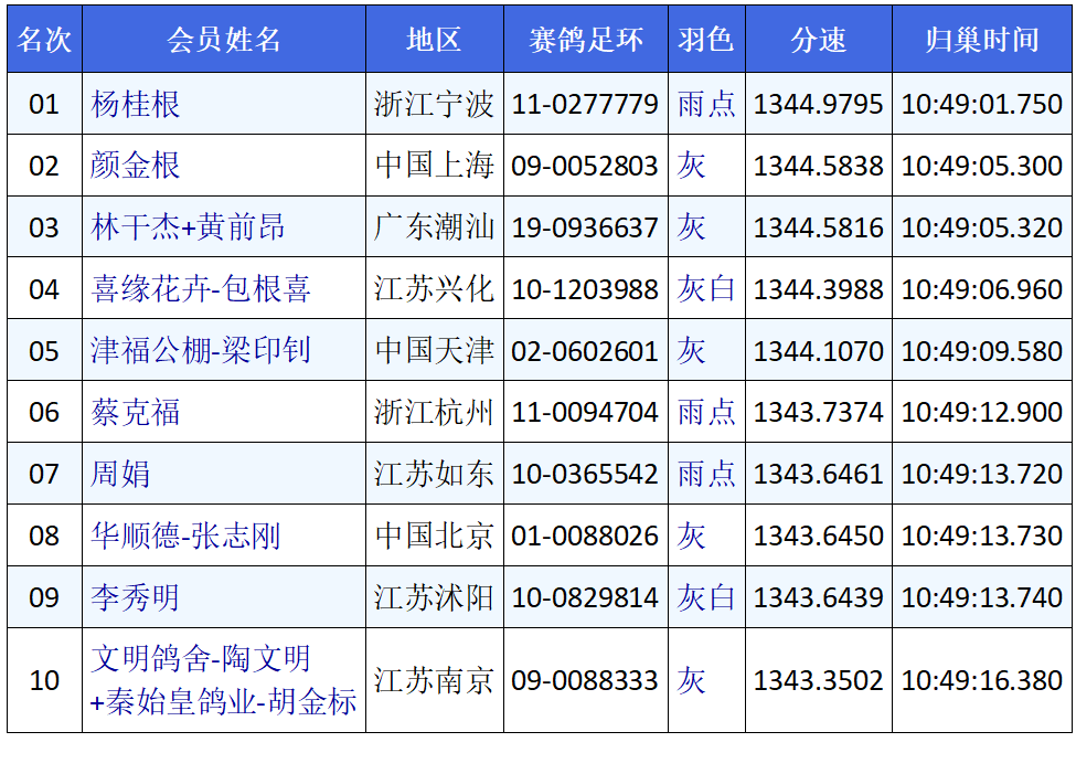 浙江宁波鸽友杨桂根麾下11-0277779雨点夺得冠军,分速为1344.9795米/分;
