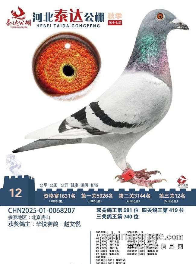 6点56分,泰达公棚530公里决赛在内蒙古境内开笼,集鸽6059羽。华悦赛鸽-赵文悦的2025-01-0068207灰白条,于13:31:49报进,平均分速1344.5421米/分,拿下决赛12名。