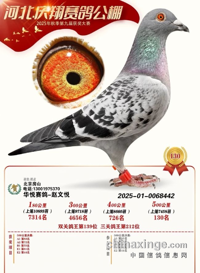 7点51分,庆翔公棚500公里决赛鸣锣开赛,集鸽7458羽,司放地为吉尔格朗图北,当日天气晴朗。华悦赛鸽-赵文悦的2025-01-0068442雨点,于13:33:59报进,拿下决赛130名。