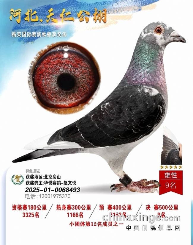 7点18分,海源公棚501公里决赛开启,司放地为内蒙古阿巴嘎旗那仁宝拉格苏木北,集鸽7044羽。华悦赛鸽-赵文悦的2025-01-0068327灰鸽,于13:17:20报进,平均分速1395.3396米/分,获决赛15名。同时,这羽悍将以预赛19名、决赛15名,摘下双关鸽王亚军头衔。7点28分,天仁公棚决赛在内蒙古吉尔嘎郎图苏木开笼,集鸽3754羽,参考空距500.231公里。当日天晴,风力2级。华悦赛鸽-赵文悦名下2025-01-0068493黑花,于13:40:16报进,平均分速1343.7284米/分,拿下决赛9名。