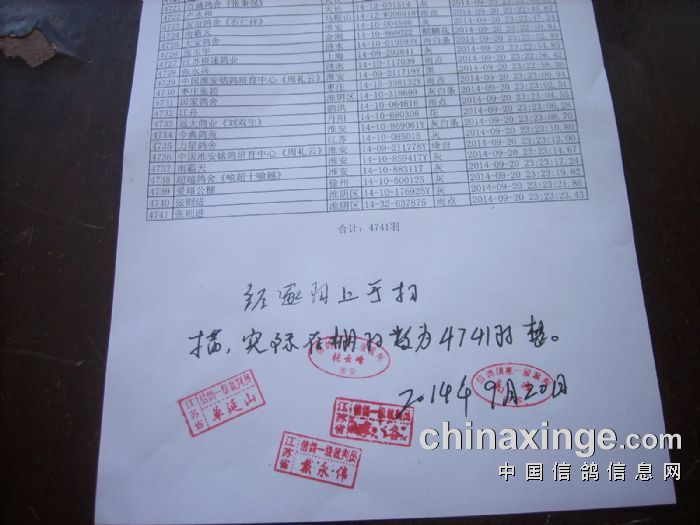 江苏奥林赛鸽公棚根据2014年第十二届478万元大奖赛,于2014年9月20日(星期六)晚上19点30分进行清棚。经裁判逐羽扫描上笼,实际在棚羽数为4741羽。