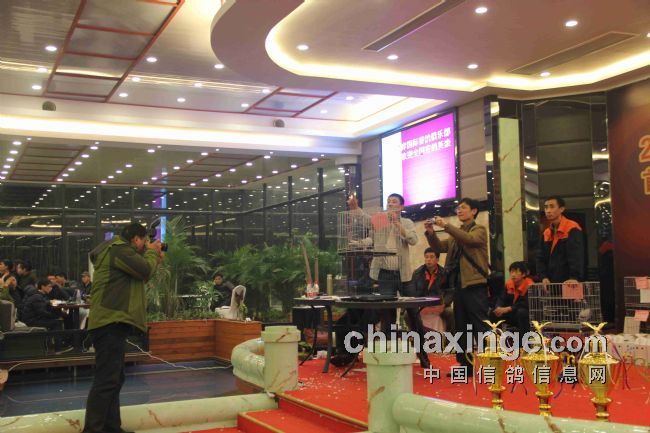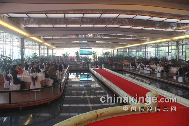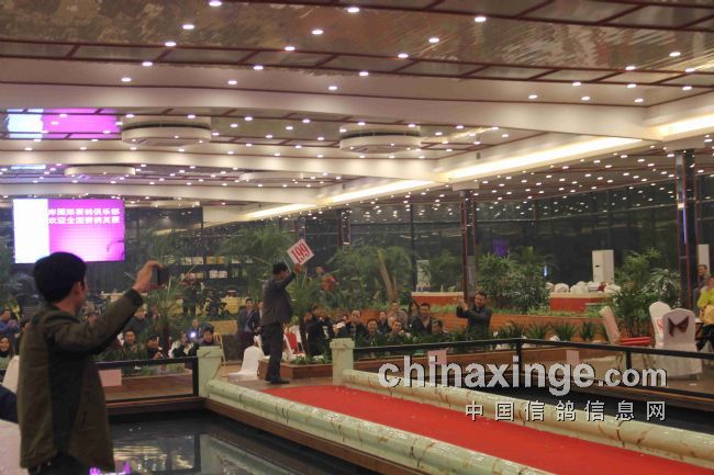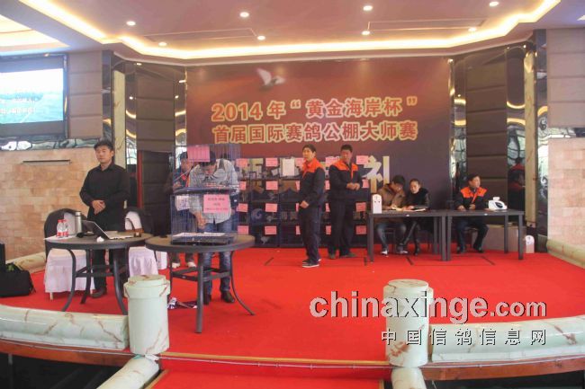 12月6日,上海黄金海岸公棚2014年第一届大奖赛获奖鸽拍卖会在上海闵行区陶家湾农庄(五星级休闲农庄)举行。拍卖选在多功能厅进行,类似于T型舞台,在T型台两旁是彩色喷水水池,拍得者需要走上T型台去交钱,好像模特出场一样令人关注,取鸽回来又像英雄凯旋一般令人羡慕,可见黄金海岸公棚独具匠心。
