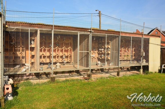 鸽舍分成3个部分,其中2间有巢盆和另一个是开放的晒笼。它们白天和晚上都呆在晒笼里。训练结束后回到鸽舍里,而里面的巢箱通常是关起来的。它们在这里进食,然后重新回到晒笼。当我们让一些鸽子配对并参加中距离赛时,在鸽子比赛返巢后,我们会让它们在最右边,离晒笼最远的鸽舍相聚,这样其他呆在晒笼的鸽子就不会被打扰到。而且我们很少会出示巢盆,比赛结束后,它们可以相聚17-18个小时。