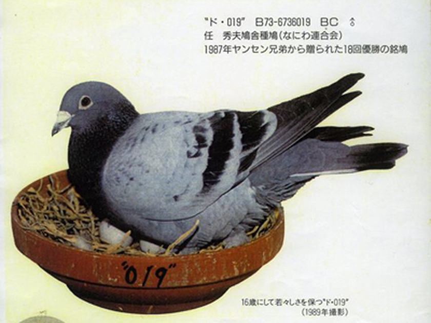 1987年12月9日,“019”由日本大阪的第三代华人任秀夫先生购入。这羽“019”是詹森兄弟为了感谢任先生一次以高价购买九羽“019”直子女,特别赠送给任秀夫先生的。大铭鸽“019”于1991年元月份在任秀夫鸽舍中去逝。