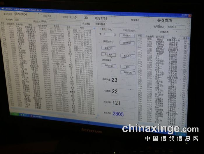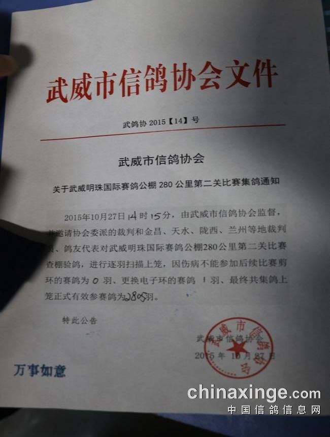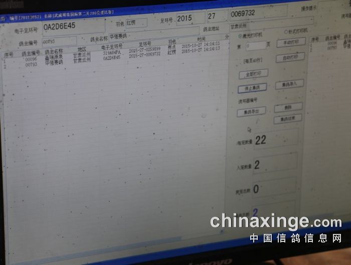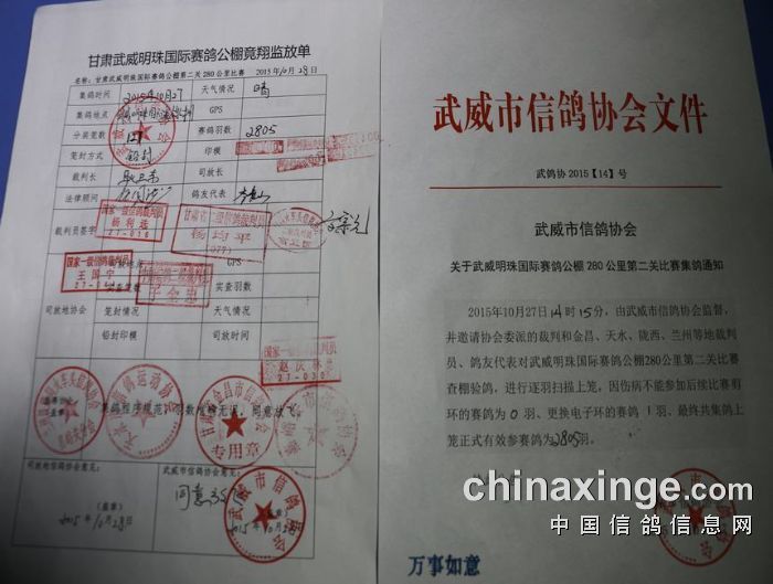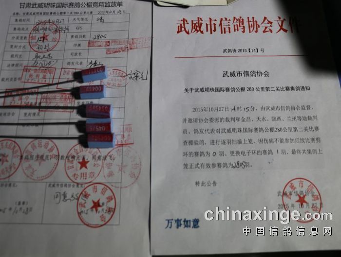第二关比赛在10月27日14时15分开始集鸽工作,由威武市信鸽协会监督,并邀请协会委派的裁判和金昌、天水、陇西、兰州等地裁判员和鸽友代表对二关比赛进行查棚验鸽。其中,更换电子环1羽,最终正式有效上笼2805羽。