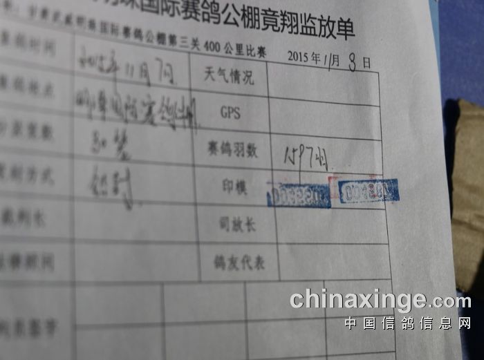 武威明珠国际赛鸽公棚第三关400公里比赛,于11月8日上午07时55分开笼。放飞地为盐池,经纬度坐标为37.40.2477,107.19.1172,海拔1440米。司放地天气晴,无风,放飞空距为385.3KM,预祝全国鸽友获得优异的成绩!