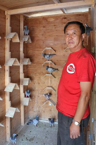 跟着他绕过守在鸽棚外两只彪悍的德国黑背犬,随着他爬梯一头钻进鸽棚,看他捧起鸽子,帮他拉出谷桶,听他像操心的父亲一样,说起关于那些“宝贝”鸽子一个又一个的点点滴滴,这就是去年在卡尔特比环鸽赛(CME)中夺得亚军的55岁华裔——徐军。