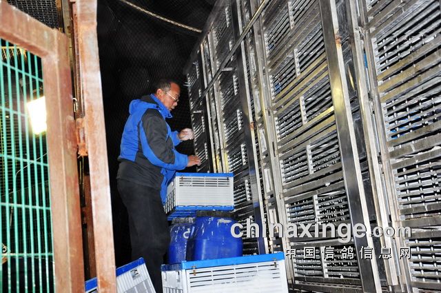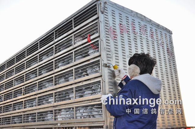 赛鸽分装在两个集鸽车内