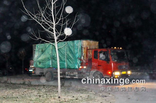两辆赛鸽车采取保暖措施后缓缓驶出公棚踏上征程