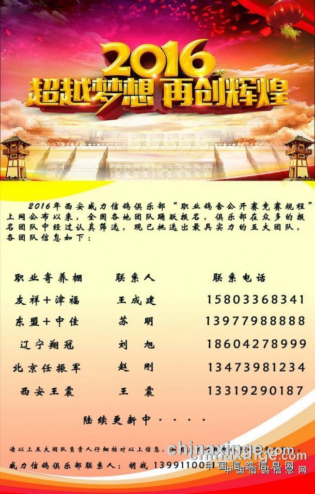 2016年,西安威力俱乐部审时度势,把握西部赛鸽运动发展主动权,提出赛事创新升级新格局。吸引全国乃至世界更多的高手前来参战,制造出更多的赛鸽神话。