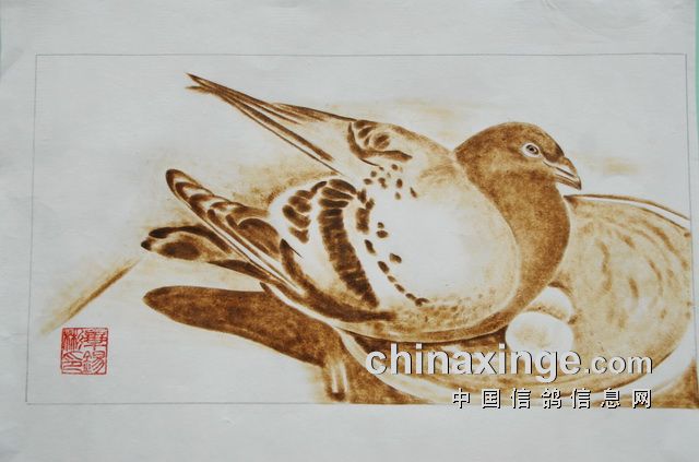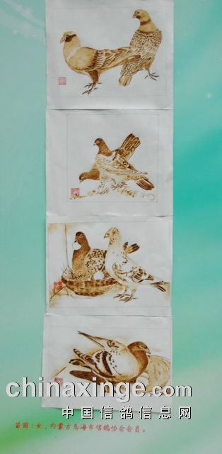 内蒙古乌海市信鸽协会选送的烫画《信鸽图》,作者:信鸽协会会员苗丽(女)