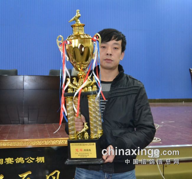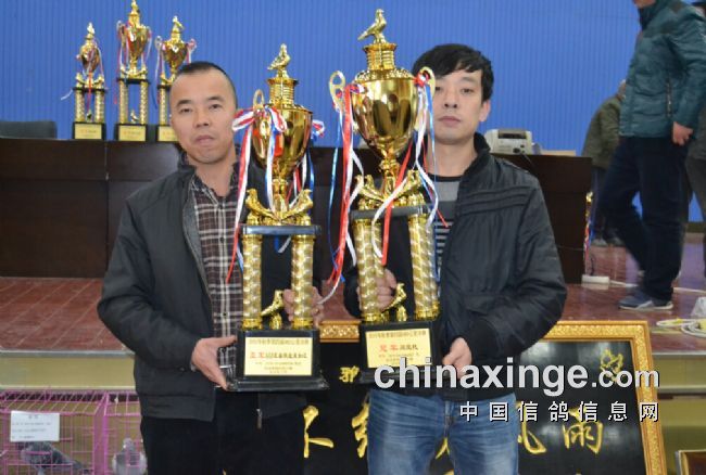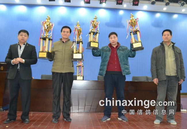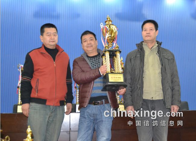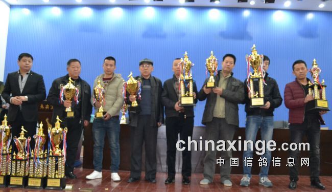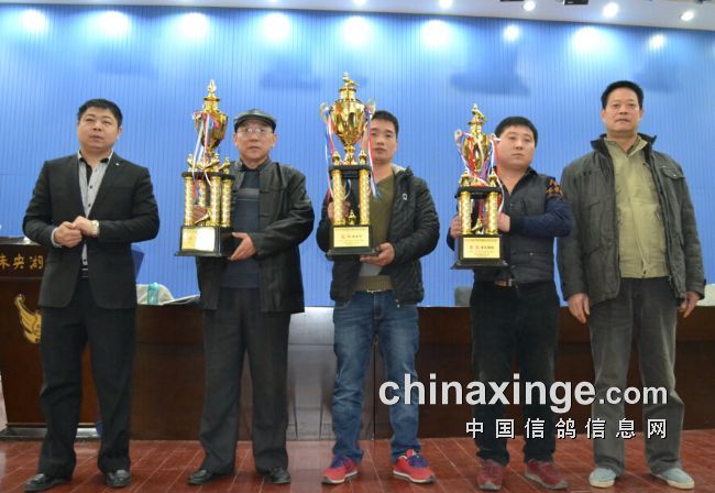 由当红拍卖师霍鸿飞、雅翔吕总、西安赛鸽名家田平安为获奖鸽友颁发了奖杯。