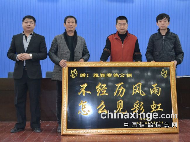 接下来由获得决赛冠军的鸽友和亚军鸽友为公棚赠送匾额,表示对雅翔赛鸽公棚的感谢和信任。预祝雅翔赛鸽公棚越办越好,更上一层楼。