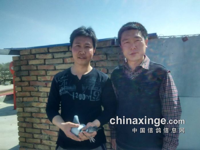 冠军鸽鸽主岳国飞,好友岳利永合照,地址岳家庄村。