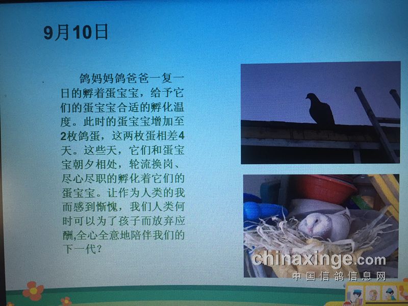 就这样,我们分工明确开始行动了。没几天鸽爸就把大的框架给定了出来,我看了以后当时就蒙了。他要讲的内容是一个关于大爱的话题,让大家通过对鸽子的了解,真正地理解父母对自己的爱。这样的素材如何来选择让我犯起了难,我在网上苦苦找了两天也没有头绪,这时想起既然要讲就讲点原创的东西吧,我们何不自己来寻找素材进行筹备。就这样,鸽爸也开始了自己真正的养鸽之路。