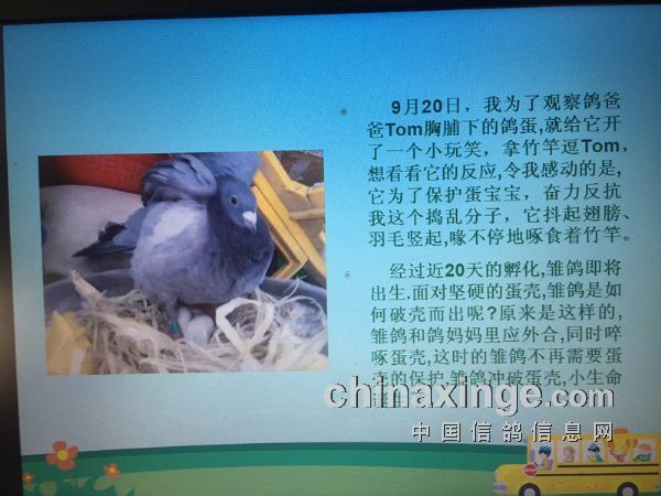 我们用手机拍了几个月的时间来记录鸽子的点点滴滴,直到上周感觉时机已经成熟,就用了3天把所有拍的照片挑选了一遍,做了讲课时要用的课件。再把所要讲的内容和图片相互融合,加上了音效,鸽爸在家也不停地试讲。直到周三,我们感觉万事俱备了,于是我就组织了我们五年级全体的师生在报告厅进行了我们筹划大半年的演讲。在活动一开始的时候,学生们就表现出了好奇心,通过鸽爸李青亮生动的演讲,全体师生安安静静地听完了整场演讲,甚至演讲结束后,大家还是没有离开的意思。这个效果让我们喜出望外,有个别的班主任还邀请我们有时间单独地再给他们班讲一下,让大家对鸽子的常识更加了解,我们当然爽快地答应了。