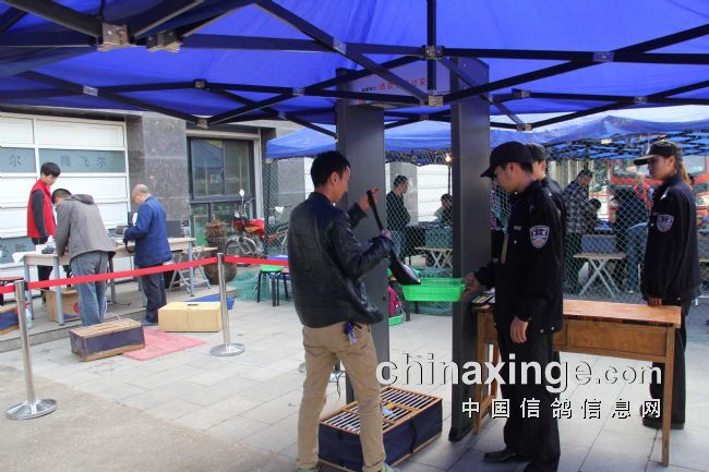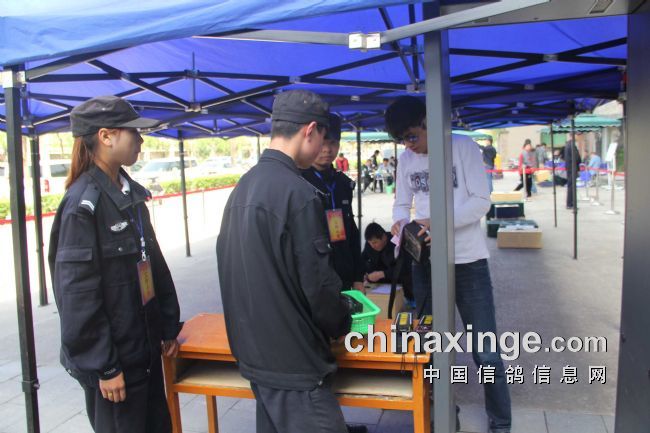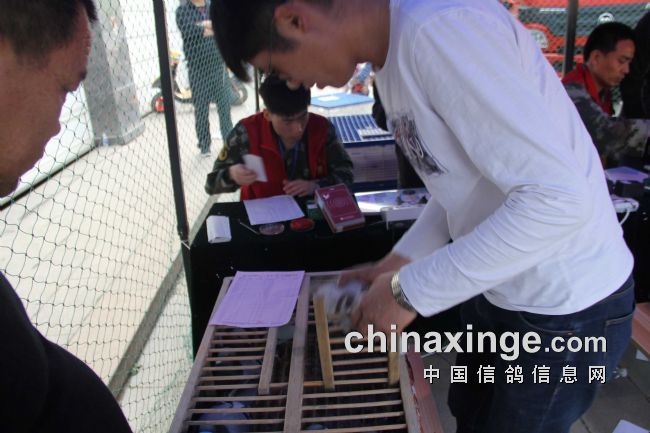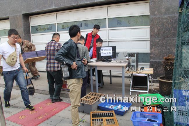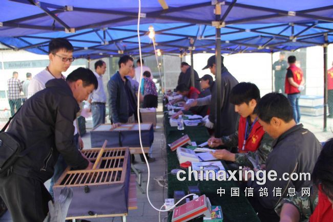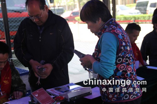 13时,集鸽工作全面开始,裁判员和俱乐部工作人员整齐到位,由于集鸽前准备工作充分,先到鸽友先领表,然后根据参赛项目缴费,再按报到顺序排队集鸽。裁判员为一羽参赛鸽子通过电子环扫描、确认参赛身份、翅膀上盖暗章、另一暗章盖在档案表上,再给足环贴上不干胶封条。