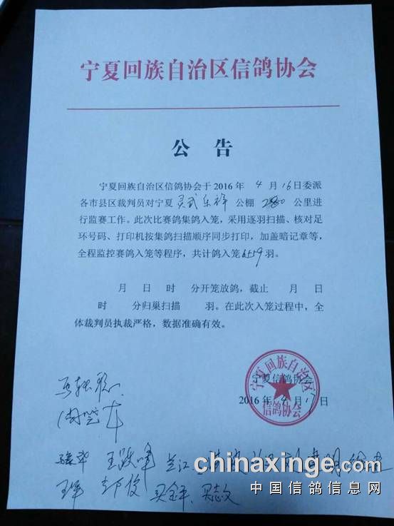 宁夏乐祥赛鸽公棚280公里预赛,由于天气原因推迟一天,4月16日上笼,共集鸽6559羽。于17日6点48分开笼,司放地点:甘肃庆城,天气晴,鸽群走势良好!