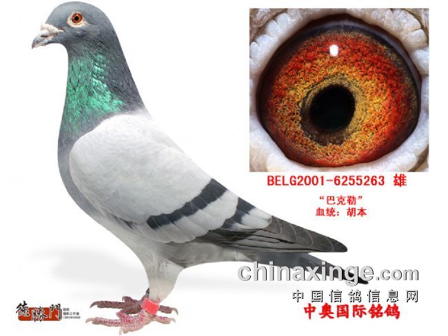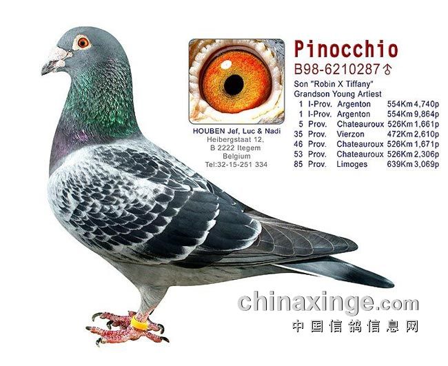 世界名鸽“皮诺曹”,环号B98-6210287,深雨点黄眼雄鸽,由胡本作出。世界名鸽“罗宾号”“蒂芬妮”直子,世界著名配对“年轻艺术家”X“小秃头号”直孙,世界名鸽“潘特”第5代。