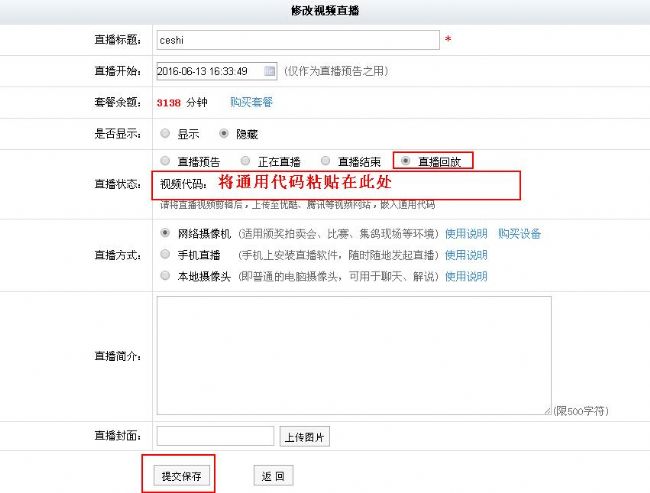 具体操作步骤如下: 1、将要发布的视频上传到优酷等视频类网站,打开视频,复制该视频播放器下方的通用代码; ![]() 登录公棚个人后台,点击进入左侧视频直播,找到您所需要回放的直播,点击修改按照下图操作:
