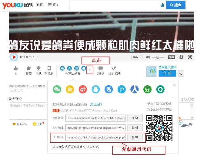 1、将要发布的视频上传到优酷等视频类网站,打开视频,复制该视频播放器下方的通用代码;