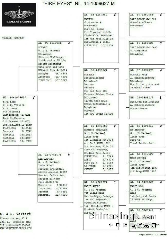“火眼金睛”(FIRE EYE)NL2014-1059627:2016年查特鲁620公里全国大赛,10029羽NPO国家赛季军、44332羽全国12个区总4名,分速1447.337米/分。