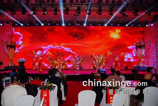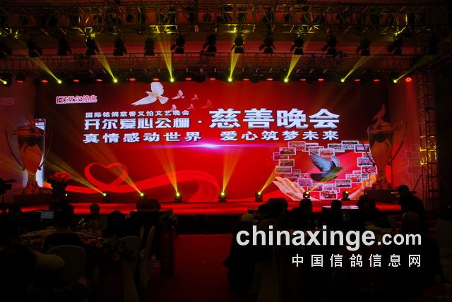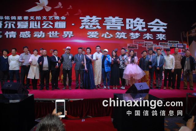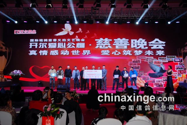 在演出过程中,穿插了十一羽慈善拍卖鸽。这些鸽子大部分都是欧洲鸽友捐赠的义拍慈善鸽。这些赛鸽都到了场内爱鸽人士的鼎力支持,纷纷慷慨解囊相助。十一羽赛鸽义拍善款24万元,另由开尔爱心公棚捐赠善款24万元,共计48万元。当场捐赠唐山市希望工程办公室。与此同时,为这些义拍的鸽友颁发了捐款证书,并合影留念。