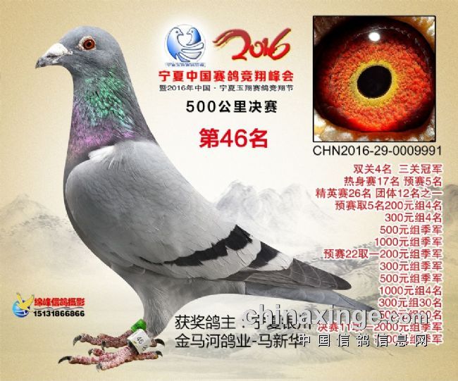 首战宁夏玉翔赛鸽公棚,获预赛5名,27名,决赛40名,46名,双关鸽王4名,8名,三关鸽王冠军,10位,预决赛共获各项指定奖金共计50余万元;