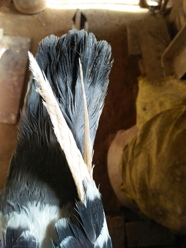 我有一羽同你的鸽一样也是雨点白条,飞出后五天回,那榜羽也这样,我也想邦他洗一下,可是是胶,还胶手,没法洗,到现在还这样,只好等换毛了