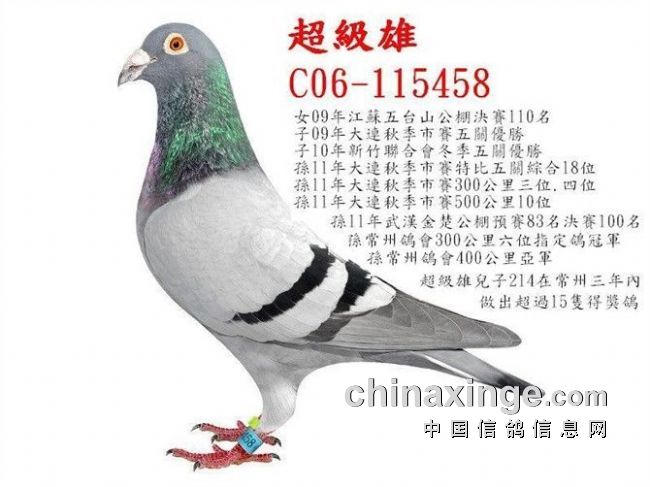 台湾传奇的鸽族,连续三代入赏海翔全船总冠军两次、五奖一次,全会五关总冠军多次。不分季节、不分风向,自主的鸽性,在最简单的管理下飞出传奇的成绩。超级雄是本舍稳定鸽族的基础种鸽,下代在两岸鸽会比赛获奖无数。