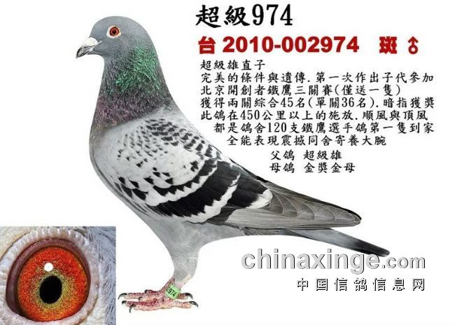 超级974是超级雄最好的子代雄之一,本身是特留种鸽,子代在两岸许多鸽会入赏多羽,是超级种鸽。