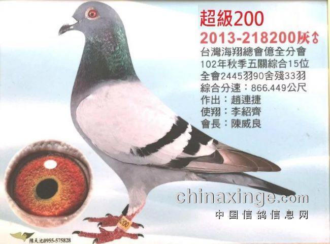超级200是超级雄最好的子代雄,本身是北海秋季五关得奖鸽,本身五关比赛单关前十名3次,恶劣天候也能得奖,标准的好天快,恶劣天候强的鸽子。移入种鸽舍后,连续四窝子代已经得奖,完美的表现。