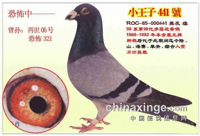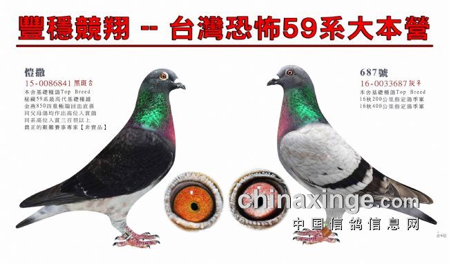 养鸽20载,接触过的品系亦很多,最终仍然独爱恐怖59系。此系以源头鸽73-345459暗灰母鸽的环号尾数命名,又因其恐怖的发挥亦称为恐怖59,59号为台湾蔡子江先生育翔,由鲍氏兄弟将此系发扬光大,其父是远洋轮船上所带回的一羽天落日本公,母亲为势山系搭配台湾另一传奇名系四号西翁,就是大家所熟知的光明希望配荣光姑娘之女所出,59号母鸽在台湾除入赏1974年元旦寿山支会综合亚军外另有七次单关冠军纪录,此鸽搭配台湾鸽界泰斗郑金城先生之势山系更是创造了连续十代以上综合冠军的奇迹!