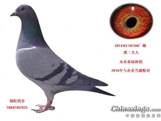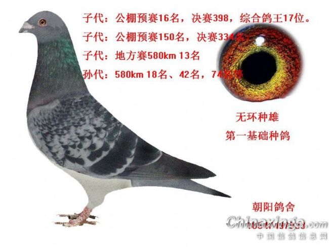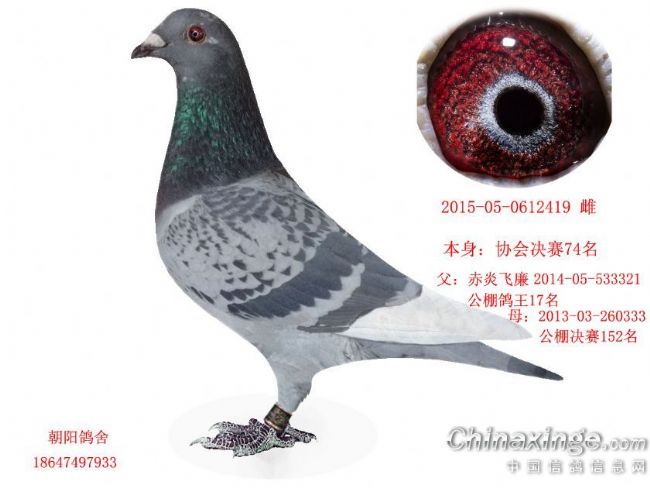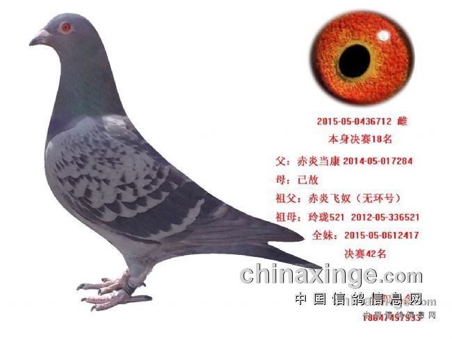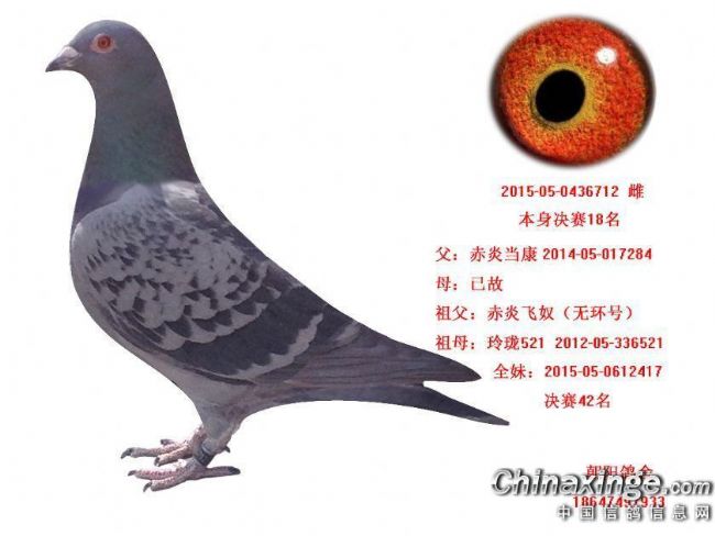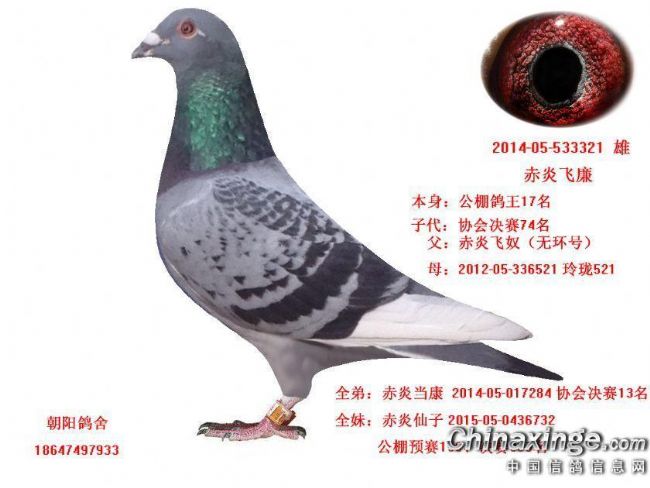 赤炎飞奴为鸽友所赠,生于13年春天,由于人为原因未套足环。所属瓦季卡694系(追溯于詹森系),其原配夫人为天落鸟玲珑521,生于12年,据查证为林波尔系。14年开始组对,秋季斩获公棚双关鸽王17名,预赛16名、决赛398名。一战定乾坤,为后续家族奠定基础。