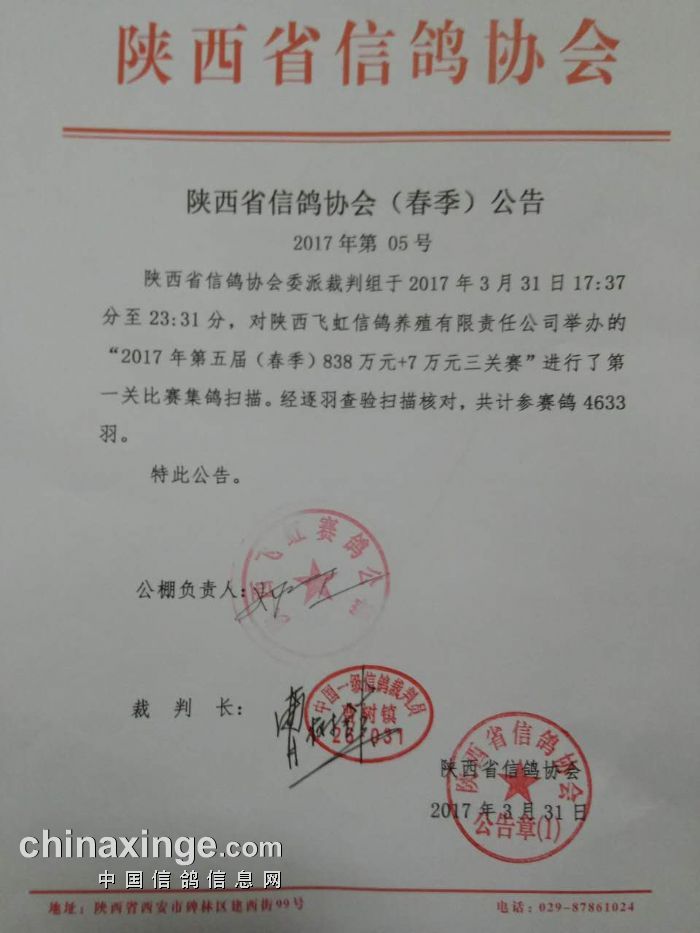 陕西飞虹公棚由陕西省信鸽协会监赛,今年第五届春季大奖赛总奖金838万元+7万元,参赛费每羽2400元,饲养费200元,合计每羽2600元,赛制为山西榆次方向三关赛。