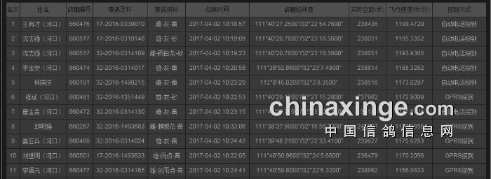 中国火车头信鸽协会襄阳分会2017年春季230公里普赛于4月2日早上7点,在河南襄城(东经:113度32分6.3700秒 北纬:33度51分22.2300秒 )开笼放飞2463羽,录取196名。