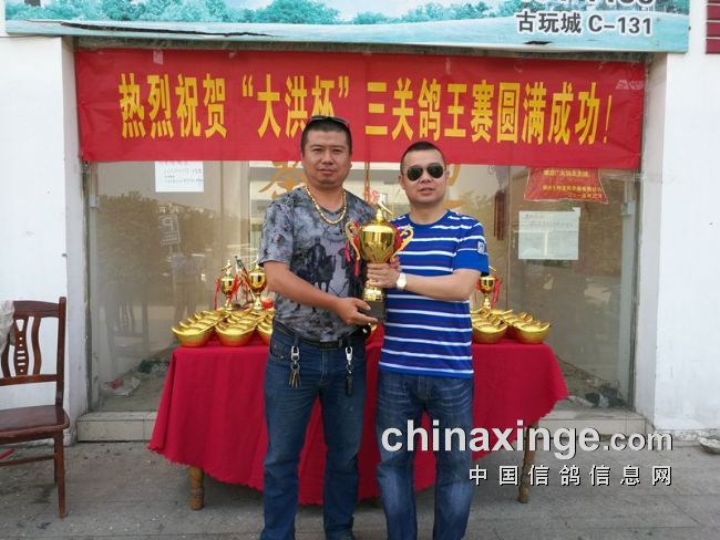 扬州大洪杯一诺千金颁奖现场 什么是品牌?是承诺到兑现!扬州邗江、五环信鸽协会筹办的“大洪杯”三关大奖赛,当初承诺的章程经过比赛的考验,用实际的行动告诉鸽友,诚信就是品牌基础,我的品牌就是承诺的兑现。 感谢扬州洪园农庄尹文洪董事长对本次大赛的支持!现场2万元现金收购三关综合鸽王冠军、1.5万元收购亚军、1万元收购季军。郑重承诺无论参赛多少,收购价不变!4-10名及其它名次面议,同时赞助本次比赛15樽江西景德镇工艺。