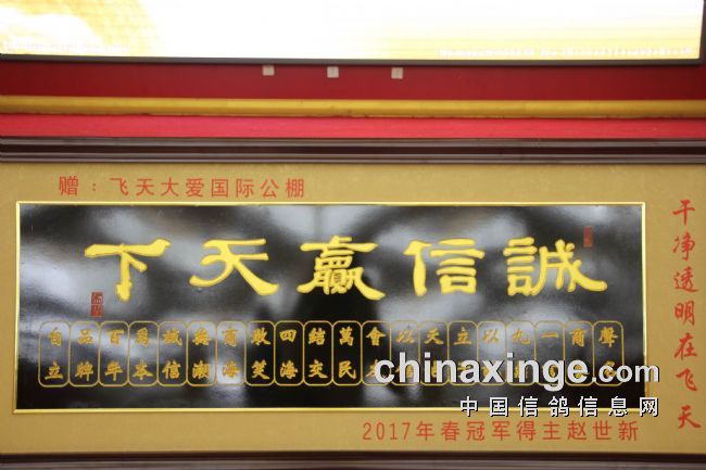 本届决赛冠军赵世新鸽友给飞天国际春棚棚赠送了“干净透明在飞天 公开诚信赢天下”的牌匾,祝新疆飞天国际春棚未来更加辉煌!
