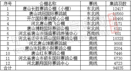目前,唐山地区公棚二十余个,吸引了来自全国各地的上万名信鸽爱好者参加竞翔比赛,参赛总数高达十几万羽。在十余家秋棚中便有4家集鸽羽数破万,创下历年集鸽之最,这也是唐山地区公棚被各地鸽友广泛认可的最好体现。(附表:唐山地区各秋棚集鸽情况一览表)