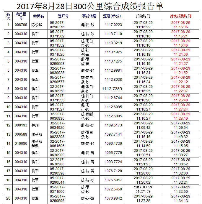 当天11:16见鸽,鸽友陈永峰的环号为05-2017-0290376赛鸽归巢,获得本场比赛冠军,分速1117.0223米/分。鸽友侯军的赛鸽在短时间内群涌而至,一人包揽第2名至11名、15至22名等多项高位,成为本场比赛的最大赢家。