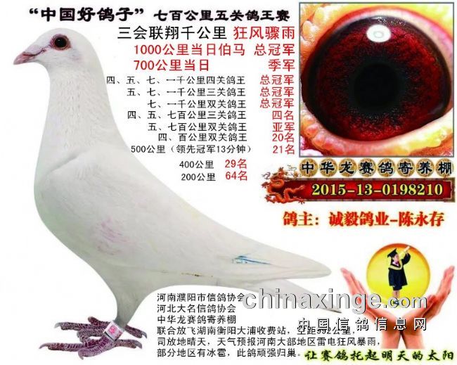 楼主这些多关赛鸽王都是什么血统鸽啊?我有一羽雨点花头白条鸽也是300-400-500-500-700-1000站站快,均进入前一百名内鸽王,血统:乔斯托内?胡本