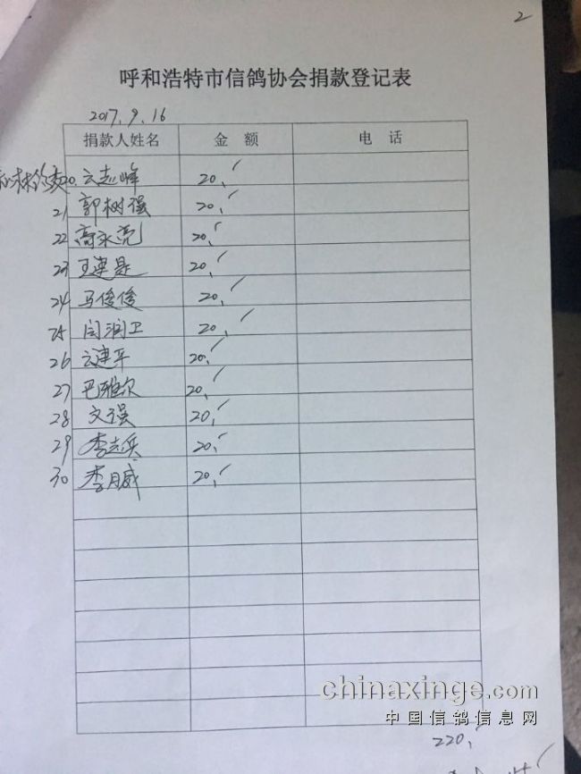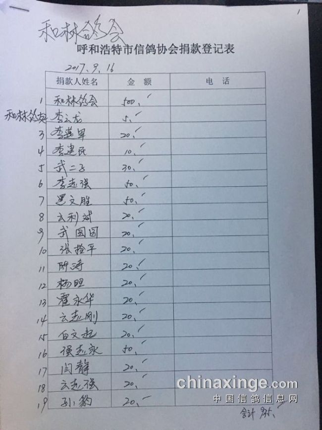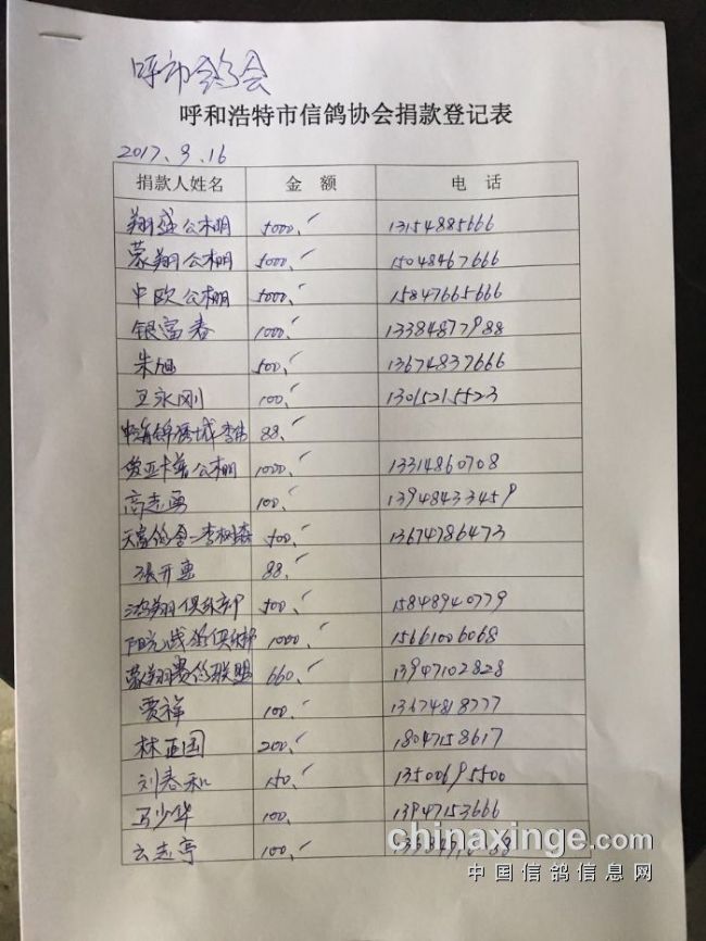 9月16日,呼和浩特市信鸽协会在集鸽现场设立捐款办公点。帮人就是帮己,在各位鸽友的积极响应下,在很短的时间里为鸽友马威捐款近三万元,鸽会将所有捐款鸽友都登记在册。昨日呼和浩特市信鸽协会委派两人将捐款交给马威,鸽友马威昨晚已乘飞机到达北京医院。传递鸽界正能量,为马威的生命助力。