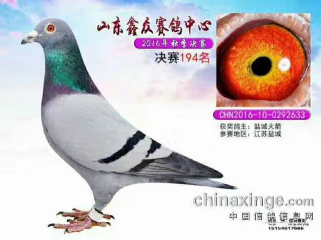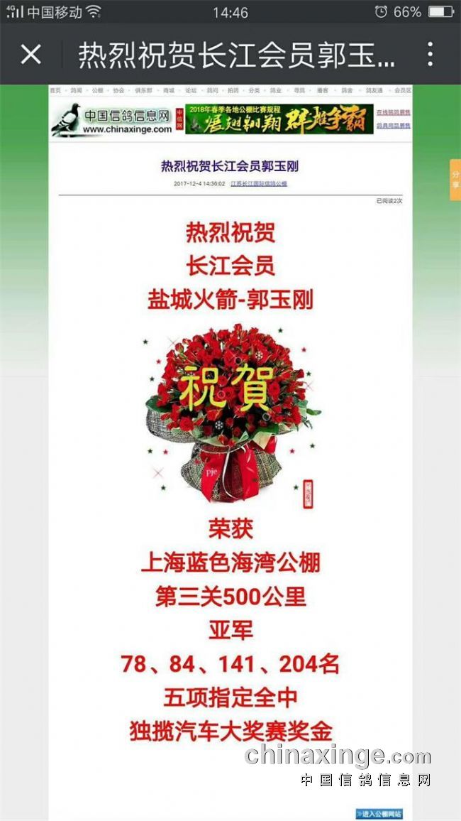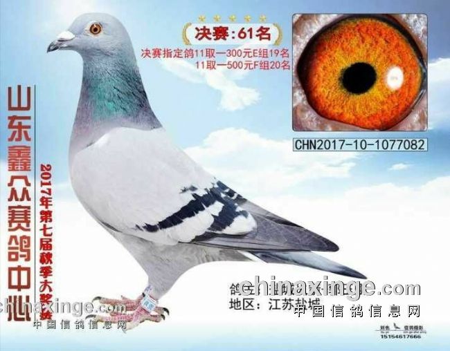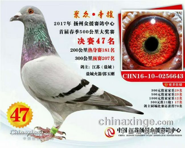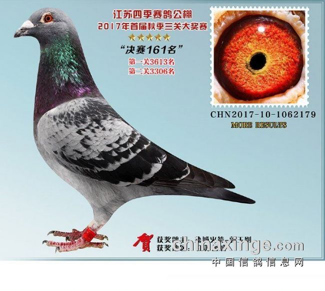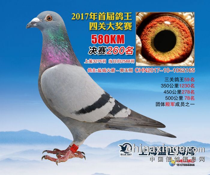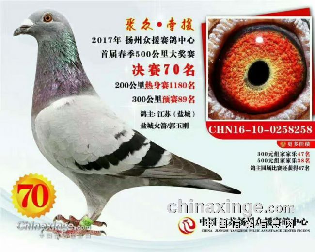 郭玉刚先生养鸽三十多年,积累了十分丰富的养鸽经验,在选种、配对上十分讲究。近年来,他的鸽子无论在地方赛还是公棚赛都非常出色,由于地理条件限制,地方赛都寄养在好友处比赛。上海蓝色海湾跑得好的161平辈姐姐,曾获得盐城全市五千多羽总冠军,另一羽姐姐寄养在上海浦东,在全市也飞得很出色。公棚赛近年获奖无数,特别是今年,凡送的公棚处处开花,纷纷获奖,算是公棚大赢家。在上海蓝色海湾580公里决赛就进奖4羽,团体殿军,其中CHN2017-10-1062161,在450公里获得季军、500公里获得亚军,单指定就获得奖金20万之巨,580公里决赛在顶风的条件下仍然顽强归巢,获得311名。盐城火箭是盐城的骄傲 ,是中国的火箭!