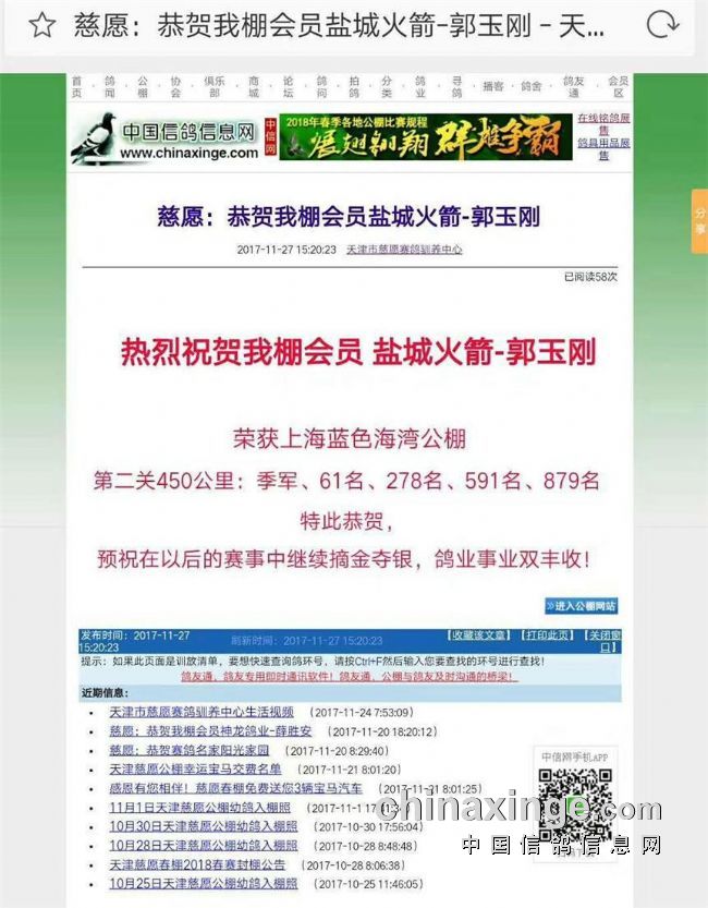郭先生很谦虚,他说:“小小成绩,不值得宣传。”本文中的照片是用手机随拍了几张,获奖鸽照片是本人在网上查到的,照片不全望鸽友们和郭先生见谅!