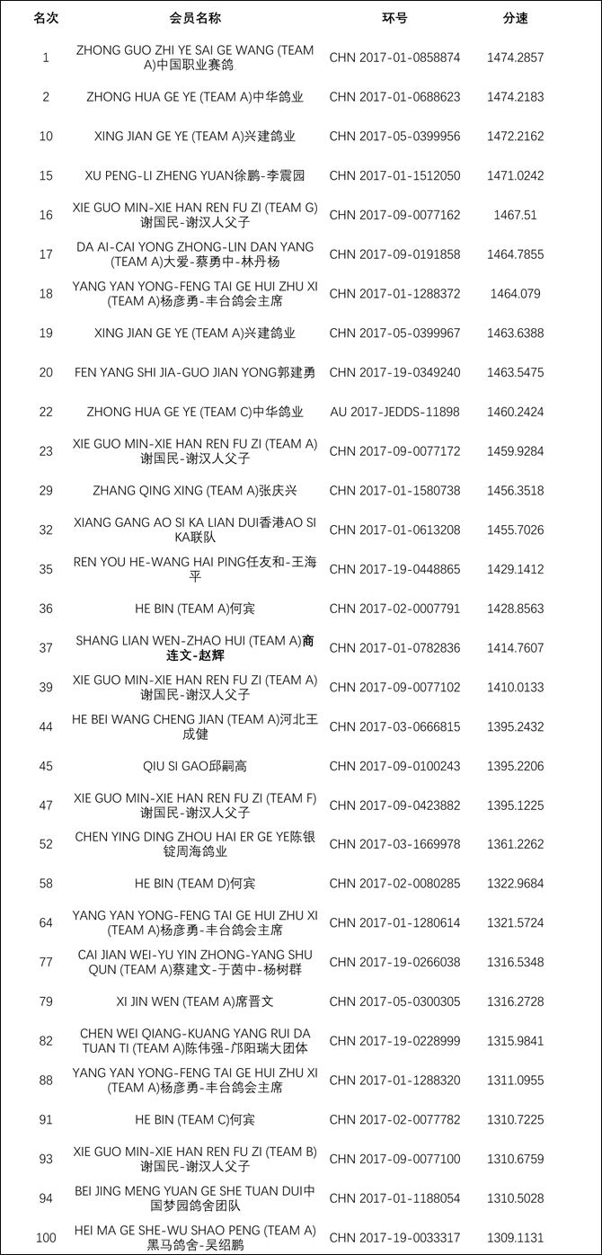 附:第二关430公里前100名中国鸽友入围成绩