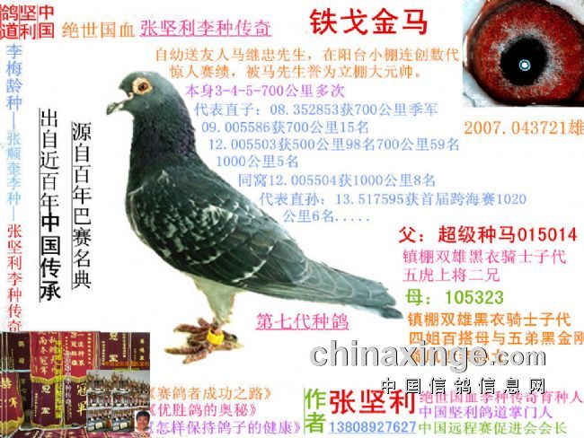 铁戈金马当年秋飞300公里2次,400公里1次,其中获300公里57名;第二年春秋两季飞300公里6次,400公里3次,500公里1次,其中300公里108名,116名,143名各一次;直到第三年飞完400公里1次,700公里1次后,在我多次敦促下才压棚做种。