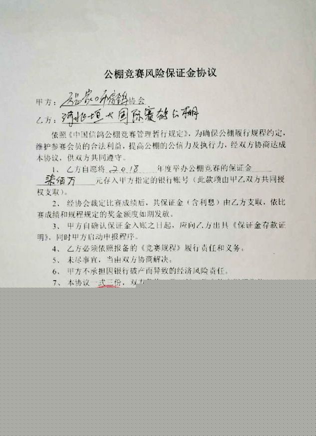 垣大《竞赛章程》开篇之首,开宗明义,首先宣布:本公棚郑重承诺:无论集鸽多少,奖金照发,规程不变。自收鸽日起,本公棚将比赛保证金存入市鸽会指定银行账户,收费结束后,本公棚将全部奖金存入市鸽会指定银行账户。5月10日,垣大公棚如约将700万奖金(总奖金的50%)打入鸽会指定的农行账户,剩余50%待收鸽结束后一并打入该指定账户,体现了办公棚承办者的高风亮节与诚信。