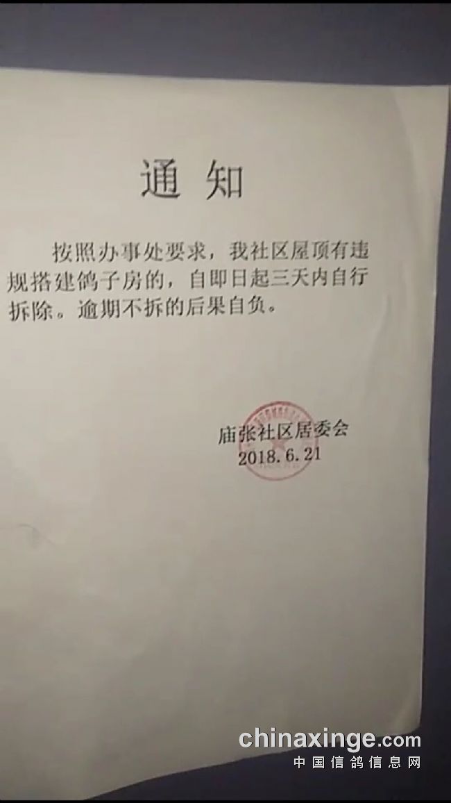 郑州信鸽协会前往祭城办事处协调拆除鸽棚问题 昨天晚间获悉,郑州祭城办事处要对辖区内楼顶鸽棚强制拆除,据郑州鸽友说是以违章搭建,要对鸽友房顶的鸽棚进行强拆。 鸽友们在得到消息以后,非常气愤,对于鸽友来说昨夜是个不眠之夜。为合理维护自身利益,鸽友们按照正规渠道于今天早上前往办事处信访办解决此事,郑州市信鸽协会委派张勤德携带相关文件前往交涉,目前此事正在谈判中!愿政府职能部门能够执政为民,合理处理此事!