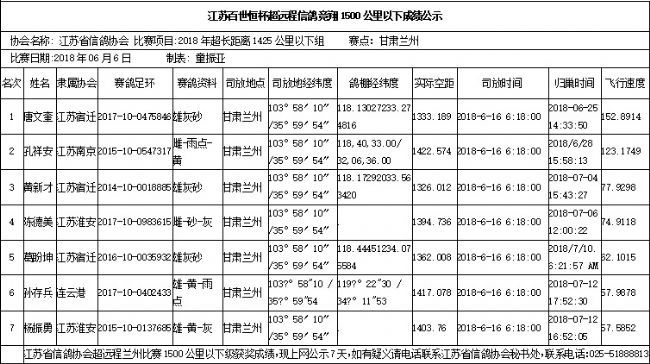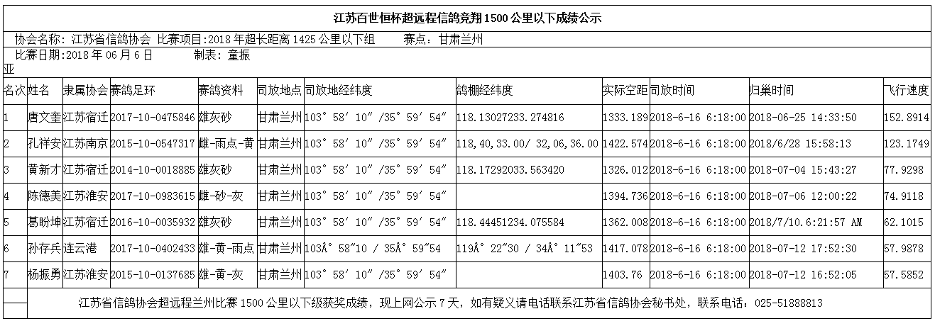 以下为江苏百世恒杯超远程信鸽竞翔1500公里以下成绩公示