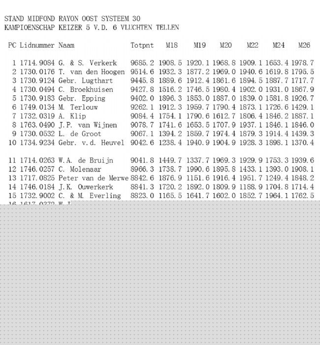 众所周知,鸽王比的不是一场比赛,而是整个赛季的综合表现,以荷兰5区为例,从赛季开始的5月初第一场中距离比赛,到7月末的最后一场,即便是因为天气原因取消了比赛,仍然多达6场中距离大赛。其中距离最短的是340公里,最长的达到了466公里,中间还夹杂着数场500-700公里的长距离比赛。在如此高强度的赛事中,别说保持稳定的发挥,能够不失格就很不容易了,这点从参赛羽数中就可以看出,在第1场蓬图瓦兹中距离赛上,佛科克所在5区东部的参赛羽数高达14688羽,而到了倒数第2场(由于上周末的比赛取消,实际上这是最后一场比赛),参赛羽数仅剩余4511羽,有1万多羽失格或弃赛,可见比赛的残酷性。在这样的竞争环境中,能够获得全省鸽王冠军,不得不说这必然是一羽发挥极为稳定,并且可以不受任何干扰的超级强悍的赛鸽,而佛科克的这羽环号为NL16-1526207的雌鸽就是其中的佼佼者。